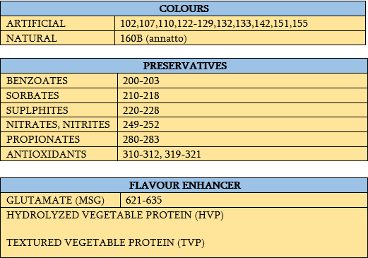 Some food intolerance symptoms are associated with food additives such as colours, preservatives, antioxidants and flavour enhancers. Following is a list of code numbers of additives likely to cause a reaction.